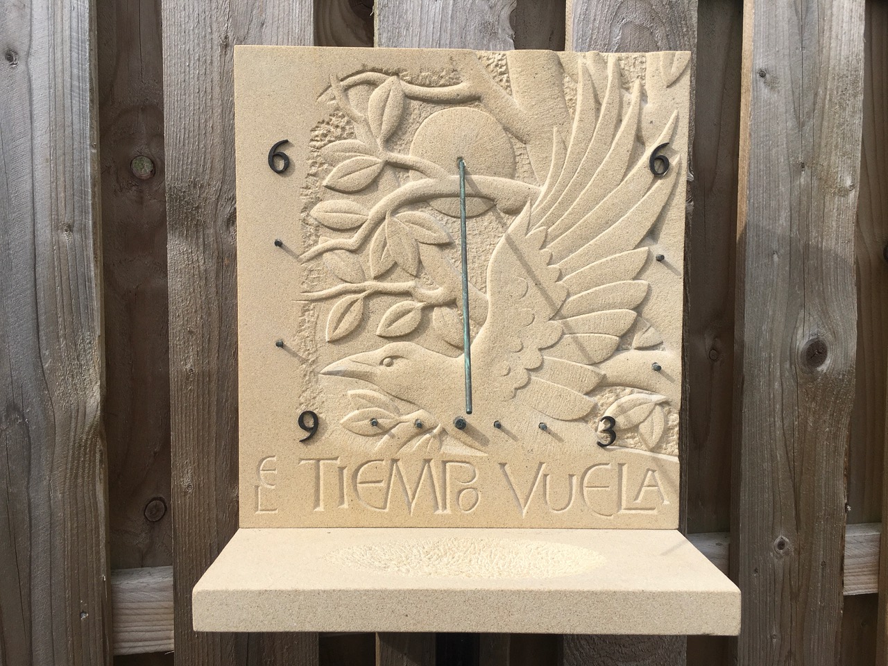 Commissioned for a private garden. A sculptural relief carved panel with a vertical sundial, depicting a crow in flight, reflecting the carved inscription; "El Tiempo Vuela" ("Time Flies"). The shelf below the panel is hollowed out to form a birdbath.